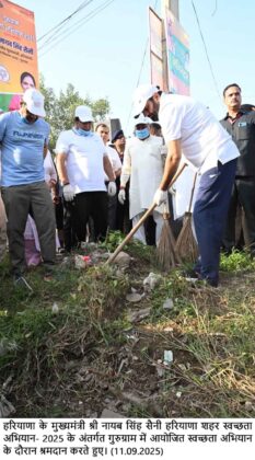 गुरुग्राम में मुख्यमंत्री नायब सिंह सैनी झाड़ू लगाकर स्वच्छता अभियान का शुभारंभ करते हुए।