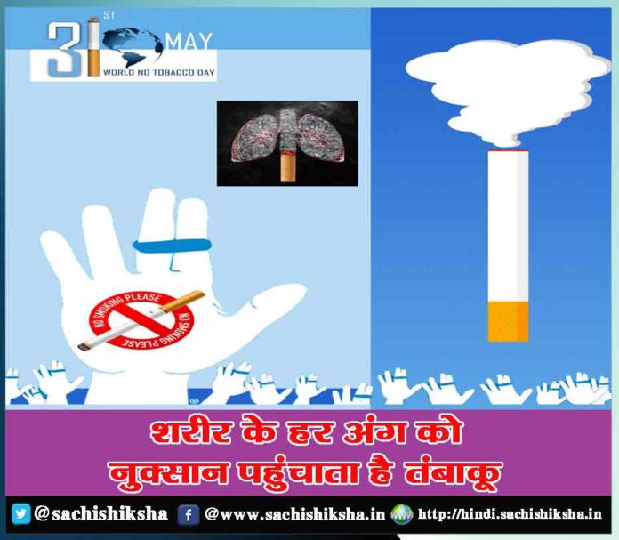 इसीलिए 31 मई को विश्व तंबाकू निषेध दिवस ( World No-Tobacco Day ) मनाया जाता है। इस दिन लोगों को इसके खतरे बताए जाते हैं। इस बार जागरूकता कार्यक्रम संभव नहीं है। लिहाजा सोशल मीडिया, फेसबुक लाइव, रेडियो/वीडियो प्रसारण, विज्ञापनों के जरिए धूम्रपान के खतरों के बारे में लोगों को जागरूक किया जाता है। एक सिगरेट व्यक्ति के जीवन के अमूल्य 11 मिनट का समय कम कर देती है।